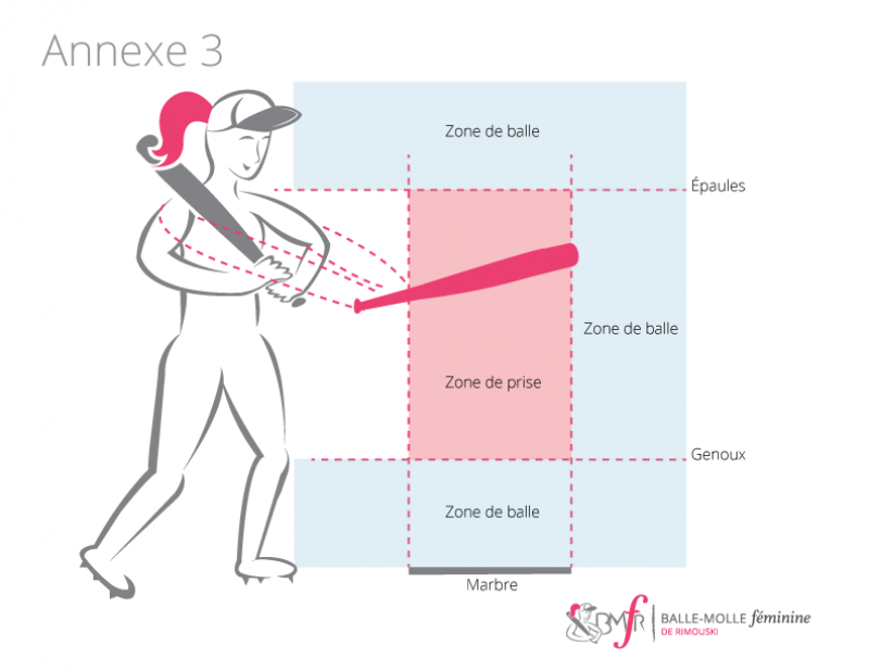 La hauteur de la zone de frappe se situe entre les épaules et les genoux de la frappeuse, et ce, sur toute la largeur du marbre. Voir annexe 3